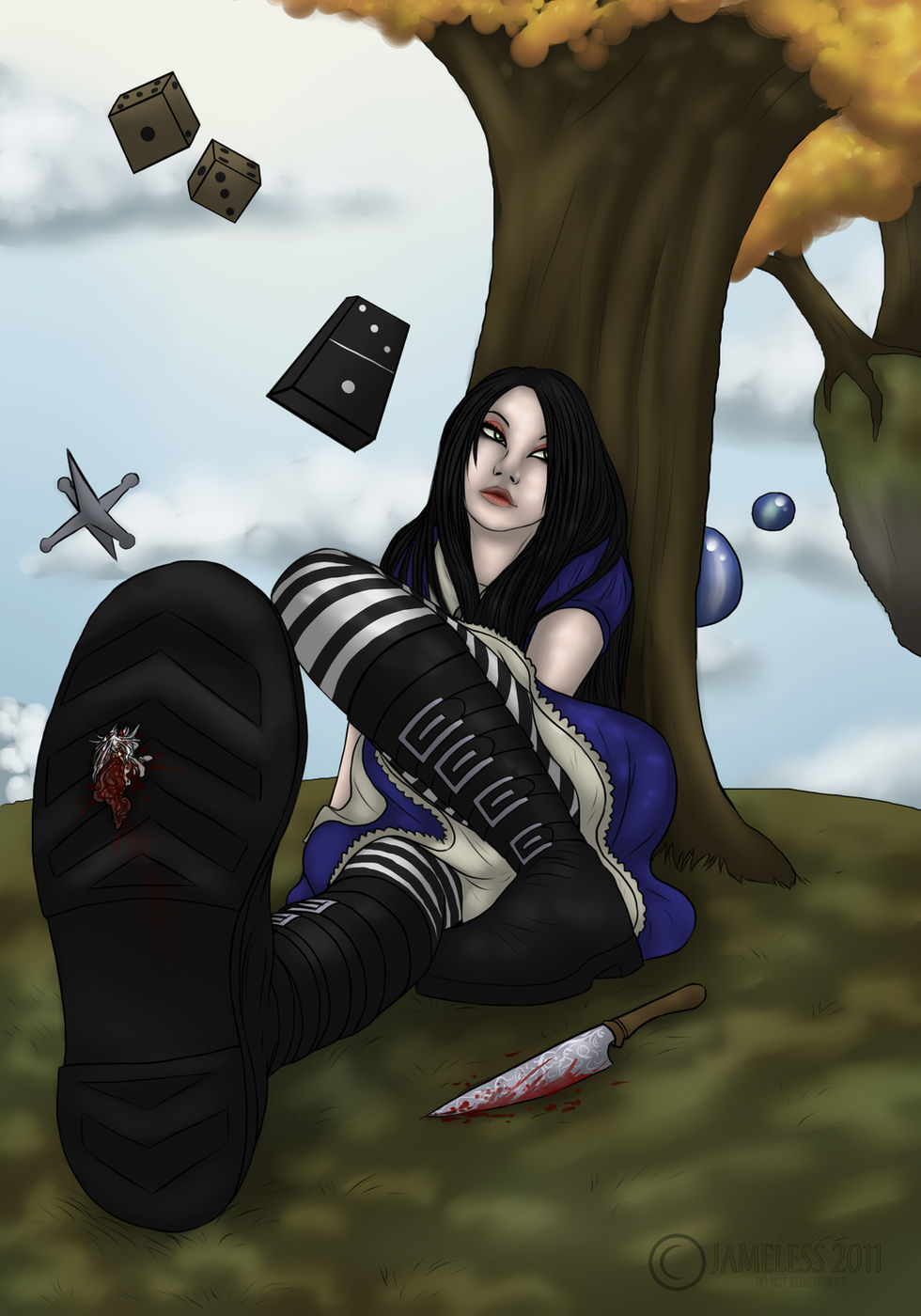 Alice had been wandering around her wonderland, her hands behind her back and the Vorpal blade in tow. Boots slid across the dirt and grass as she went, not noticing anything below her feet at all... She didn't notice as her boot covered the little one, and stepped forward casually.
