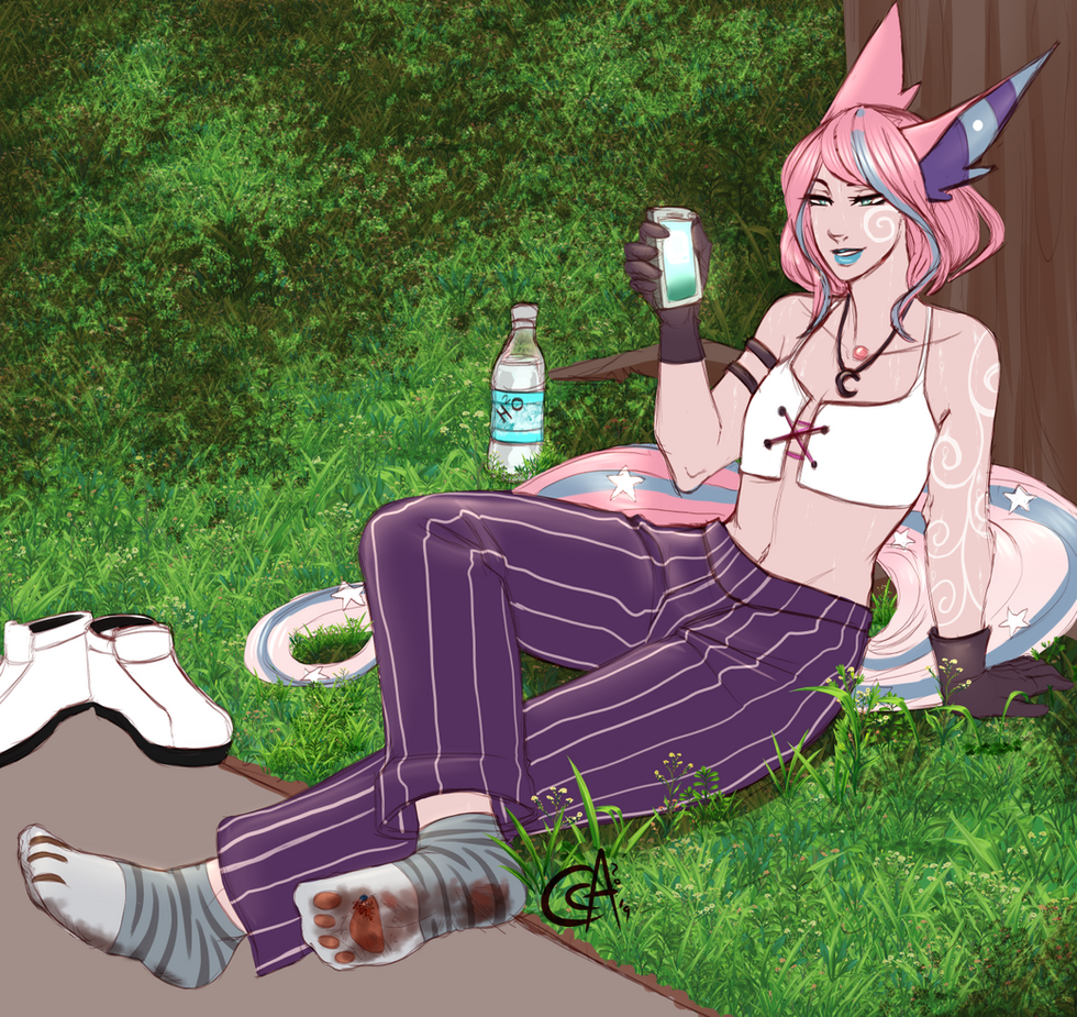 Casually, she pulled her shoes off her feet and set them aside to let them air out a bit. Such a hot day, such sore little paws of hers... She leaned back, setting her bottle down next to her and holding her phone with her right hand now. She didn't even think to check the bottom of her foot... Why would she? There was no reason to even think that there was a living being in there.