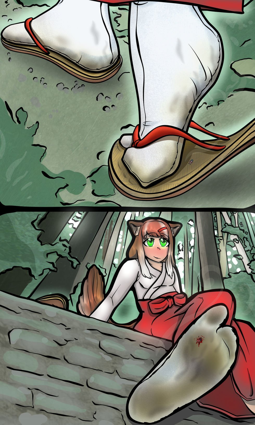 "Aghn..." Mat gasped as her foot lifted again, blood spewing from his little mouth. He was stuck to the fabric of her sock, his skin pressed deep into the material. His vision began to fade to red as he watched the woods swing by, before the space between her foot and the Zori Sandal disappeared once more.